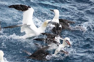 In the stormy month of November 2013, the BENTHIS crew joined a cruise on board the French research vessel ‘Thalassa’ in the Bay of Biscay. After every haul, the researchers prepared a standard meal from the catch. Often groups of more than 100 hungry feathered friends were following the ship. The portions contained a mix of 75 roundfish and 50 individuals of cephalopods, Norway lobster or boarfish. Depestele and Laffargue fed the birds experimentally by throwing the discards into the water, and then recorded which birds fancied which prey.